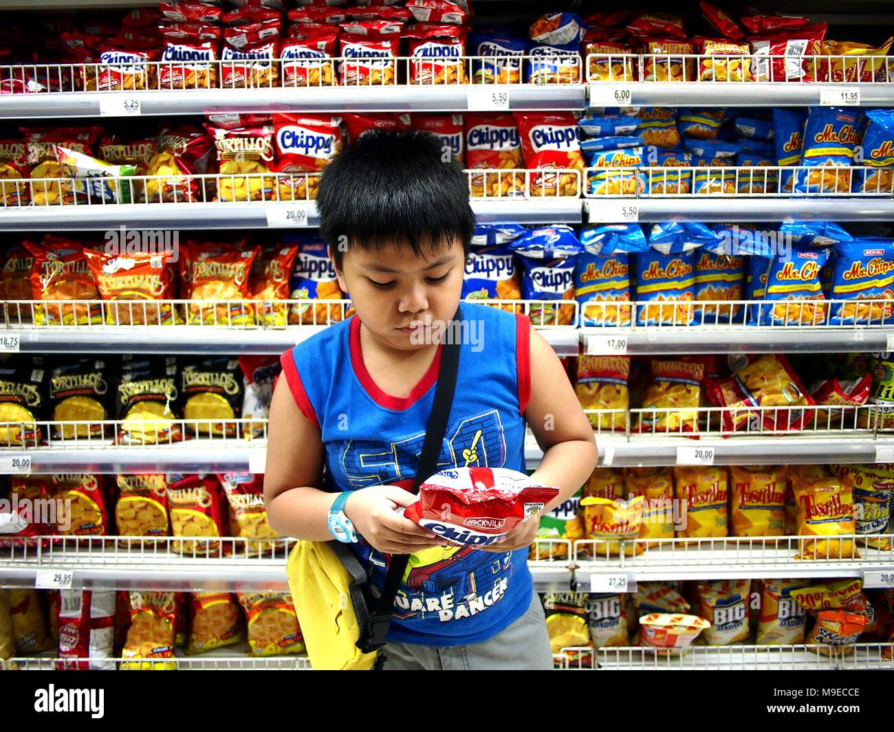 Antipolo City Philippines March 15 2018 A Young Boy Reads The Label Of A Snack Food Inside A Supermarket Stock Photo Alamy
